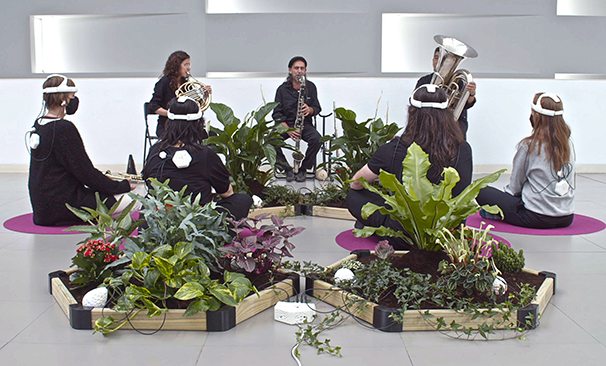 Instal·lació amb plantes, objectes mecanitzats, i vídeo projectat.